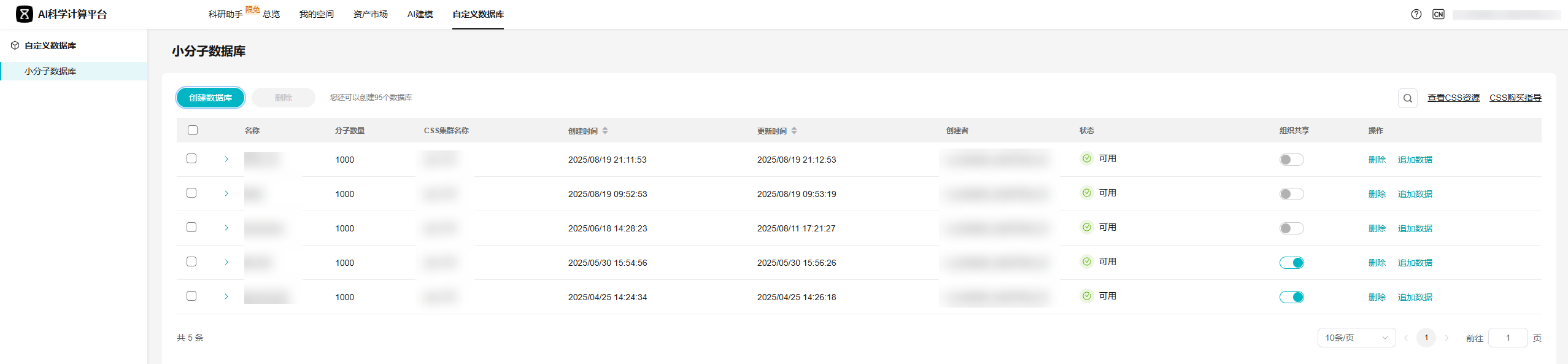 - 数据库列表展示数据库的名称、分子数量、创建时间、状态等信息。对于已创建的数据库,可以执行删除和追加数据操作。数据库状态介绍如下: