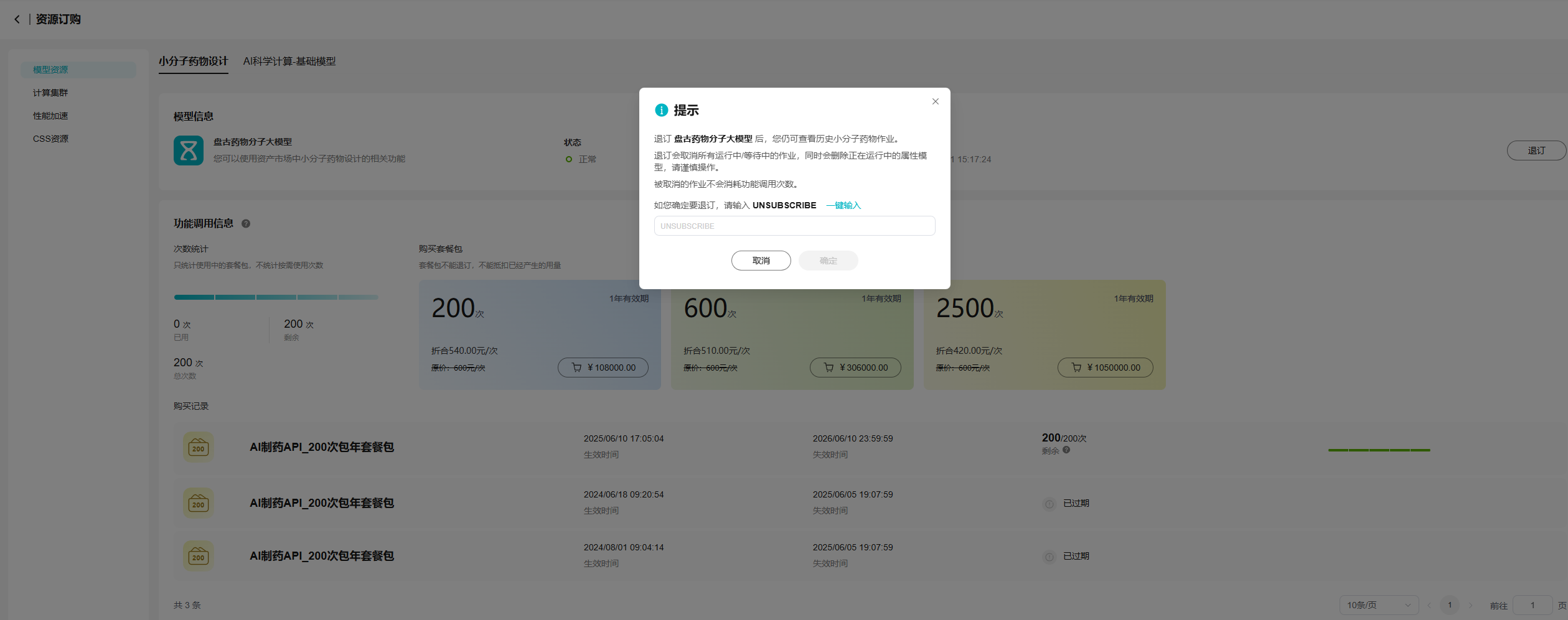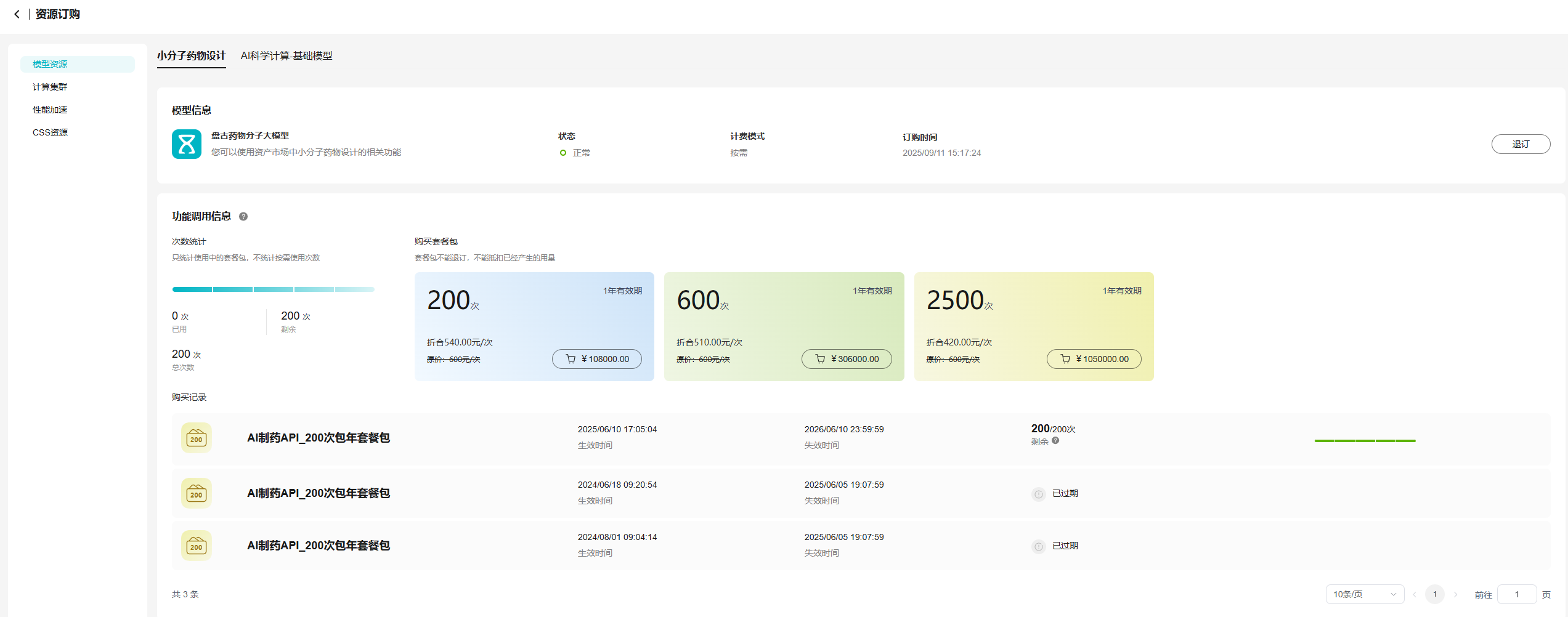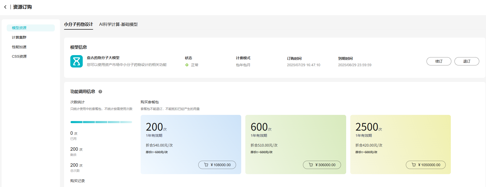 AI科学计算服务创建药物作业和提交属性模型作业需要开通盘古药物分子大模型,用户可在资源订购页面的模型资源中进行订购,可参考开通服务。此章节详细介绍了盘古药物分子大模型续订、盘古药物分子大模型退订,及功能调用套餐包购买等相关操作和查看相关功能调用信息。