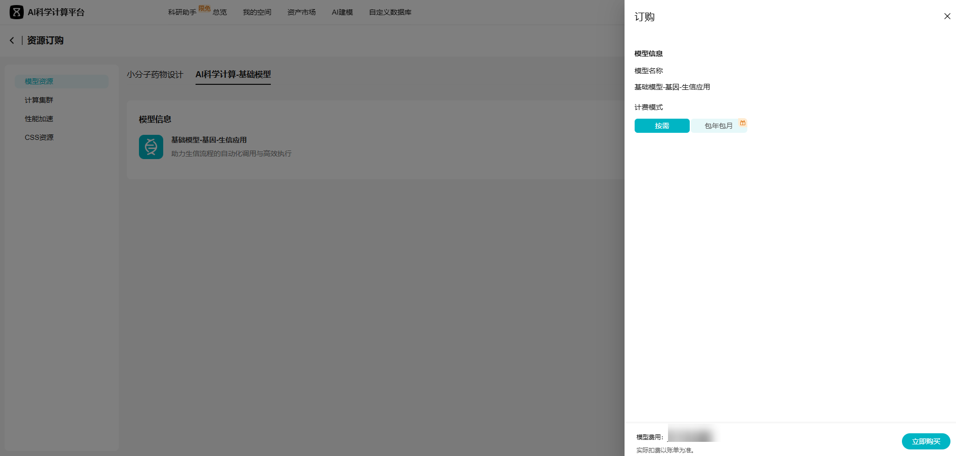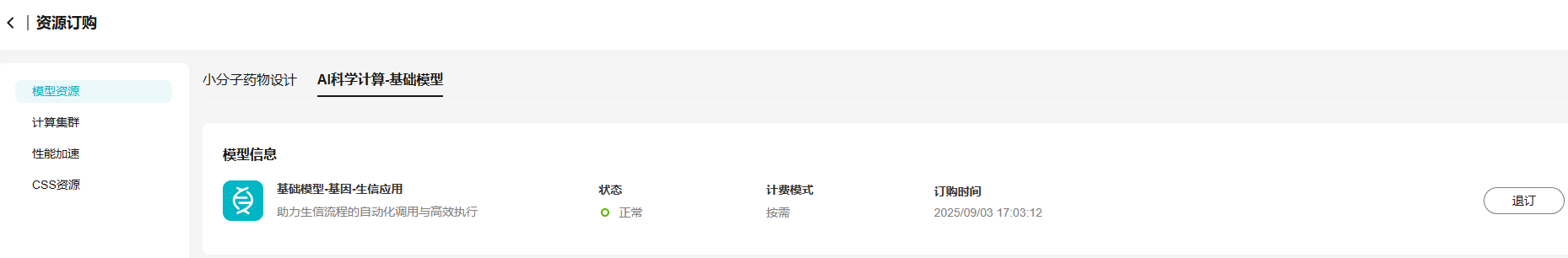 在AI科学计算平台中,用户需要使用基因模型相关的生信应用进行生信流程的自动化调用与高效执行。用户需通过订购流程获取使用权限,并支持平台管理员进行订购和退订操作。