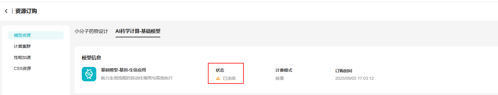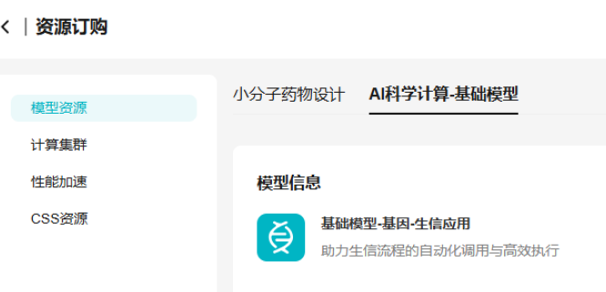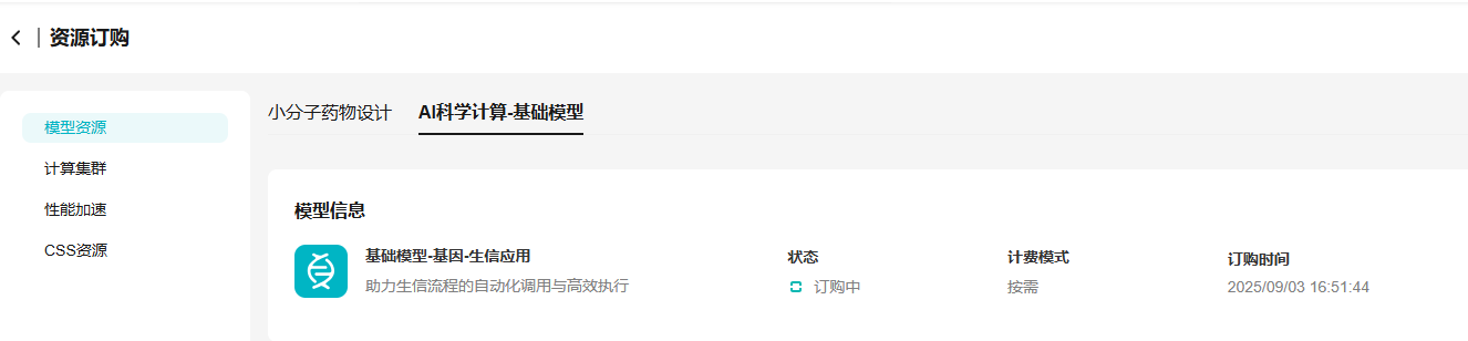 - 进入AI科学计算服务平台,单击右上角账号名,选择“资源订购”,并进入“模型资源 > AI科学计算-基础模型”页面。