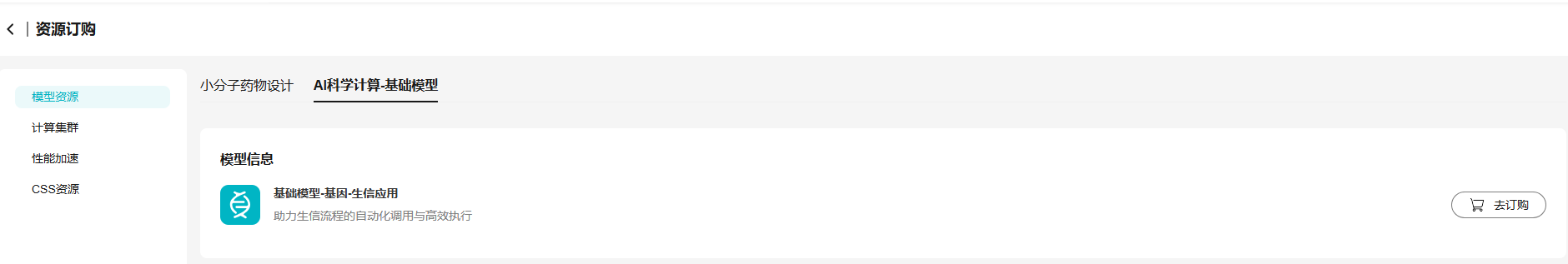 - 进入AI科学计算服务平台,单击右上角账号名,选择“资源订购”,进入“模型资源 > 小分子药物设计”页面。