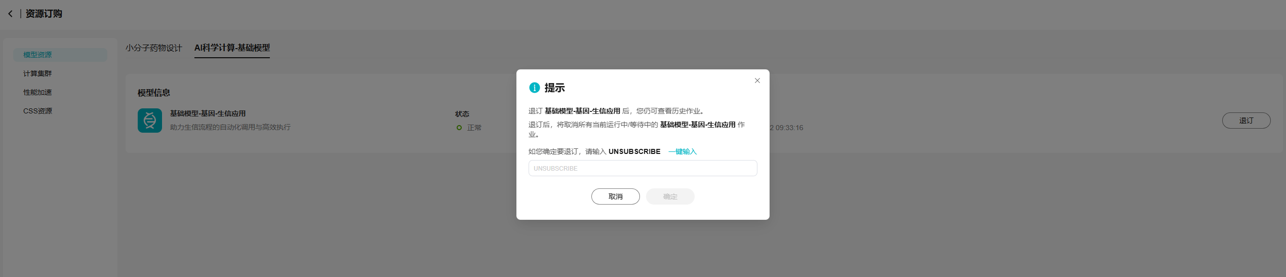 - 查看盘古药物分子大模型,选择“退订”。退订后有取消作业的提示信息。