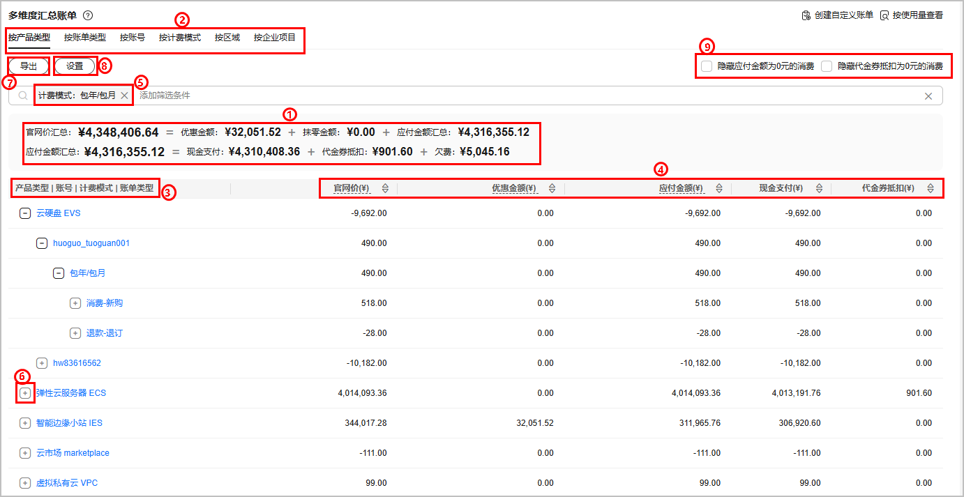 - 退款汇总:账单类型为退款的汇总金额,如包年/包月退订、降配等。