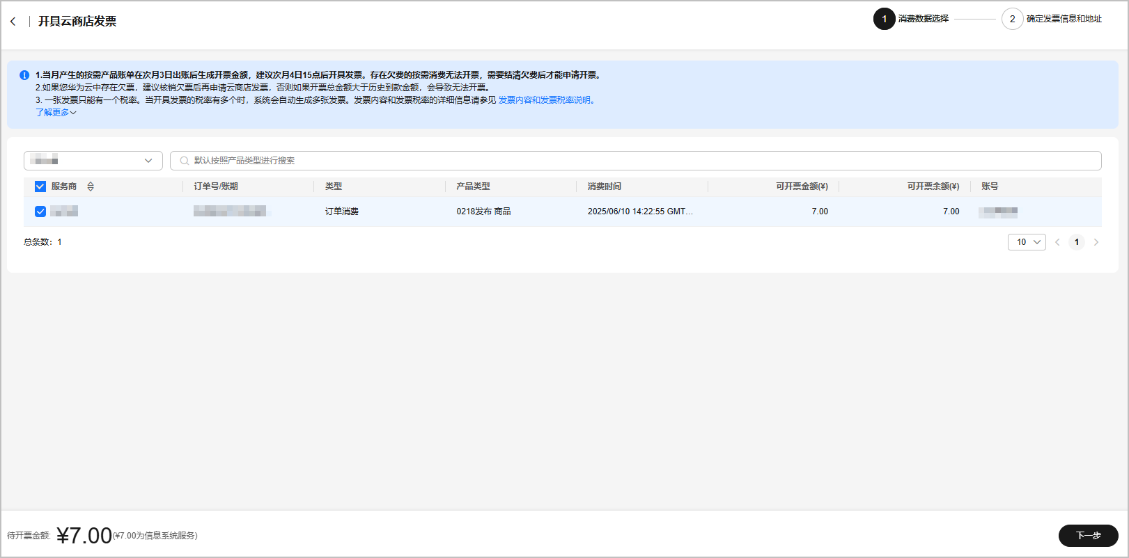- 云商店只支持根据订单金额进行开票,不能自定义金额开票。勾选订单后,会自动展示该服务商的全部订单。