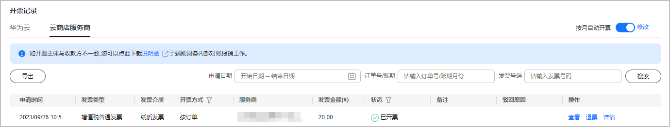- 如果云商店的开票申请被驳回,将会发短信通知您驳回原因,您可在“开票记录”页面“云商店服务商”页签,单击操作列“查看”,获得云商店的联系人和联系方式,进行后续的沟通。