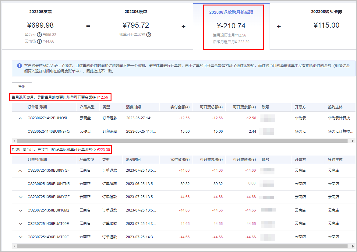 - 云商店可开票金额:由服务商开票,可开票产品包括在华为云商店购买的完全由第三方服务商负责的产品(具体参见云商店产品详情页说明)。