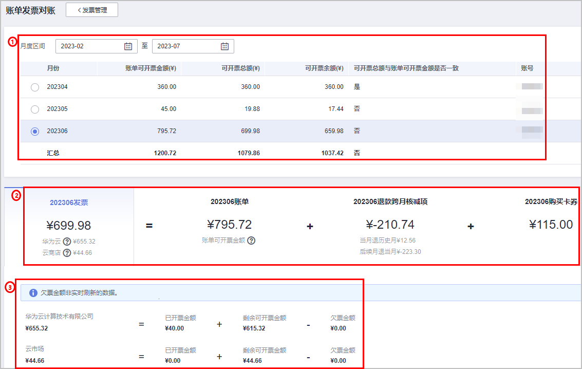 月度可开票金额包括:华为云可开票金额和云商店可开票金额。