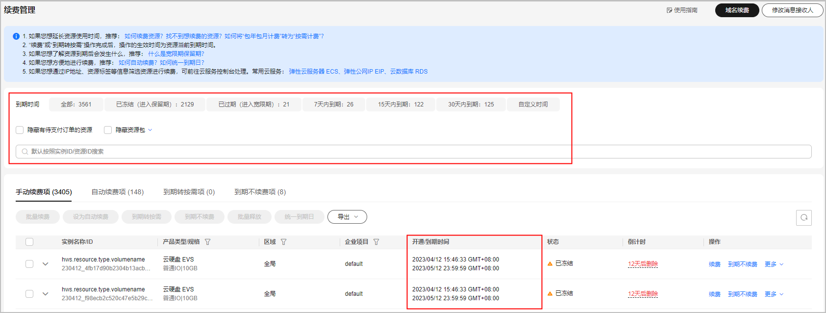 进入“续费管理”页面,可通过“到期时间”快速筛选实例,在续费列表“开通/到期时间”可以查看实例具体的到期时间。