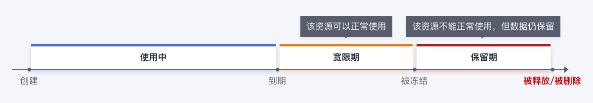 - 宽限期到期后进入保留期,保留期内该实例会被冻结不能正常使用,但对存储在该实例中的数据仍予以保留。