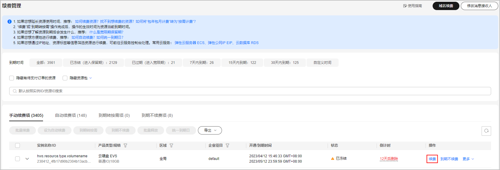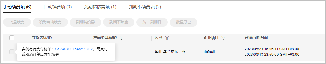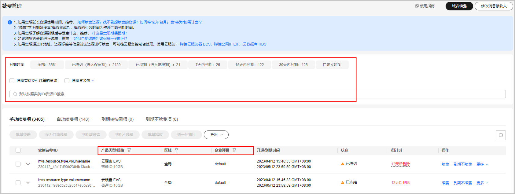- 续费管理支持根据实例状态、到期时间、实例ID、实例名称、订单号、产品类型、区域筛选实例。开通企业项目管理的客户还可以根据企业项目筛选实例。
