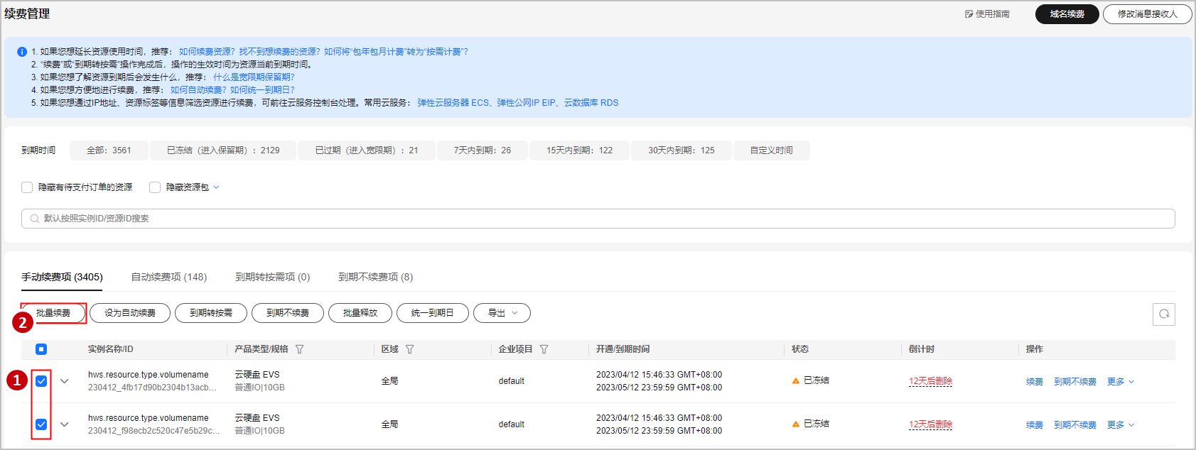 - 批量续费:勾选待续费实例,单击列表左上角的“批量续费”。