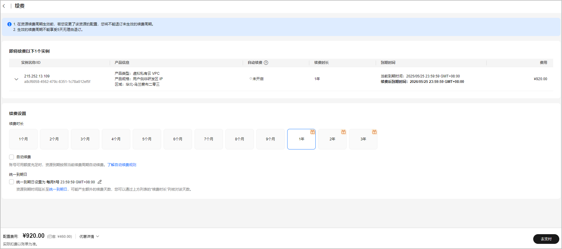 - 确认实例信息,设置续费时长,单击“去支付”。