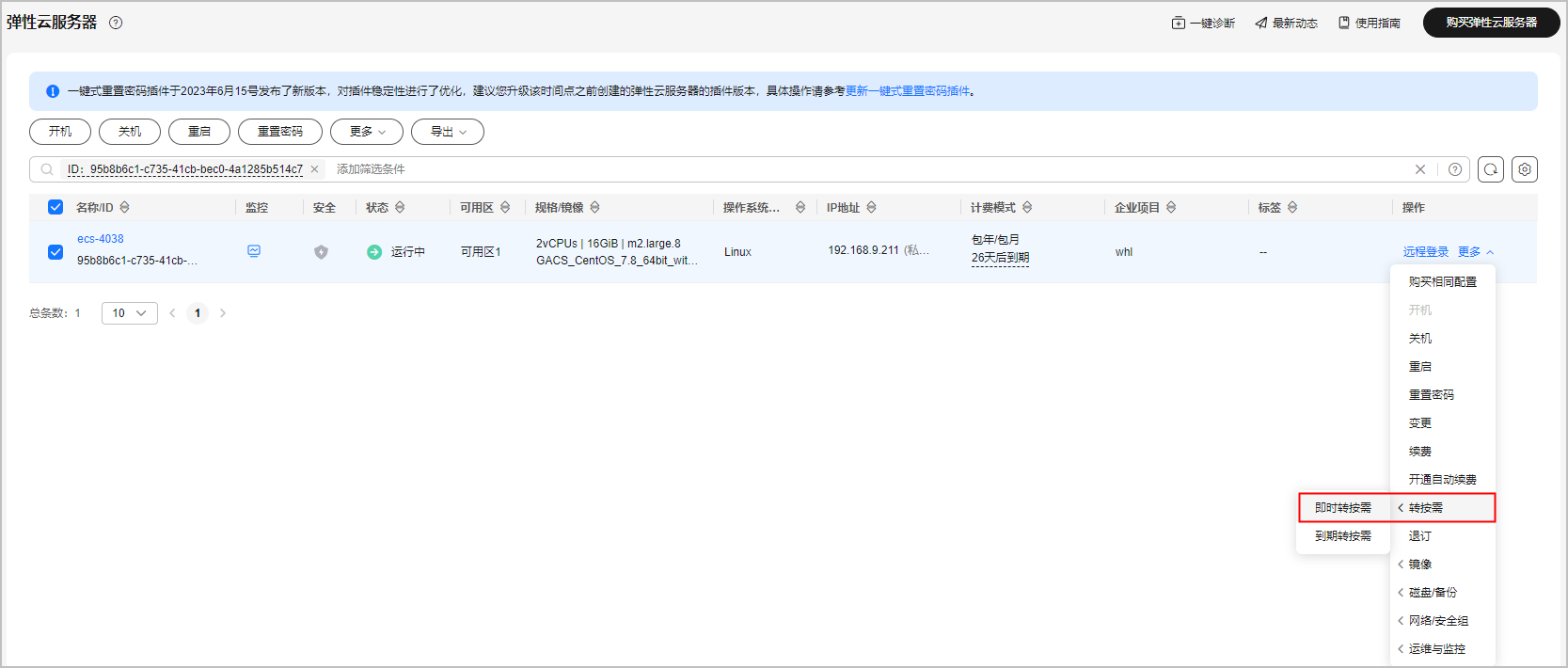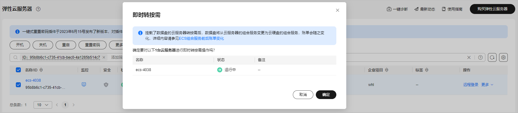 以“弹性云服务器”为例,介绍如何包年/包月即时转按需。