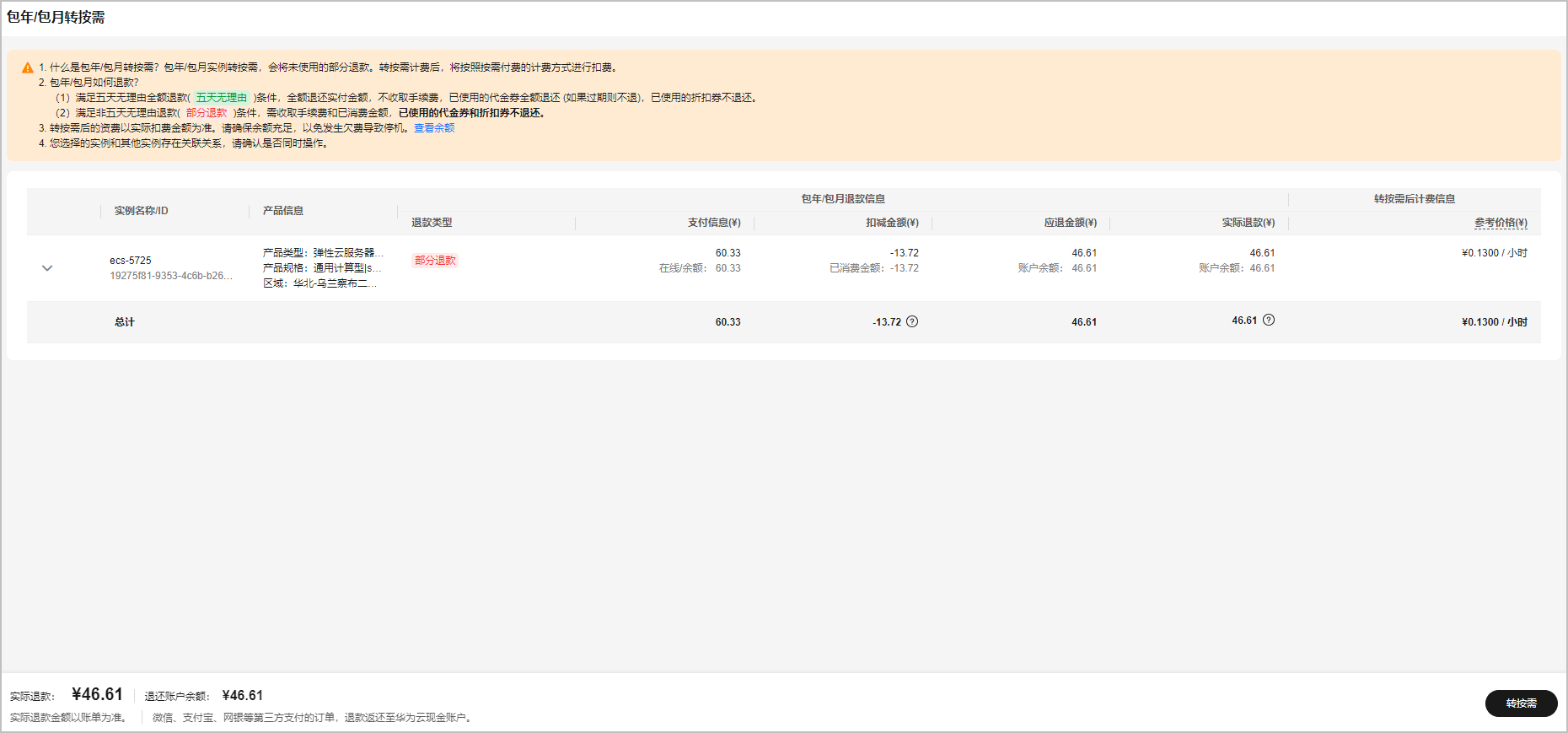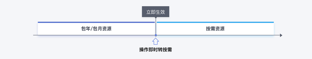 客户可以将资源的计费模式由包年/包月立即转为按需。包年/包月即时转按需会退还当前周期的剩余费用,退款完成后,按需的资费模式立即生效。