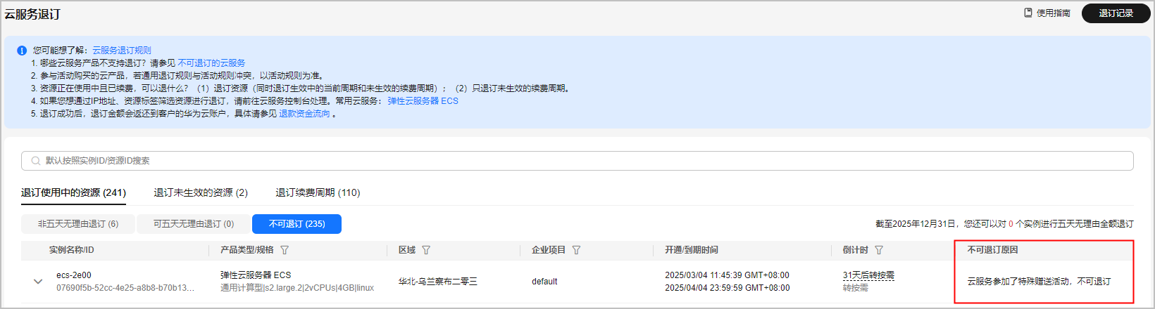 - 进入“云服务退订”页面,选中“退订使用中的资源>不可退订”页签。