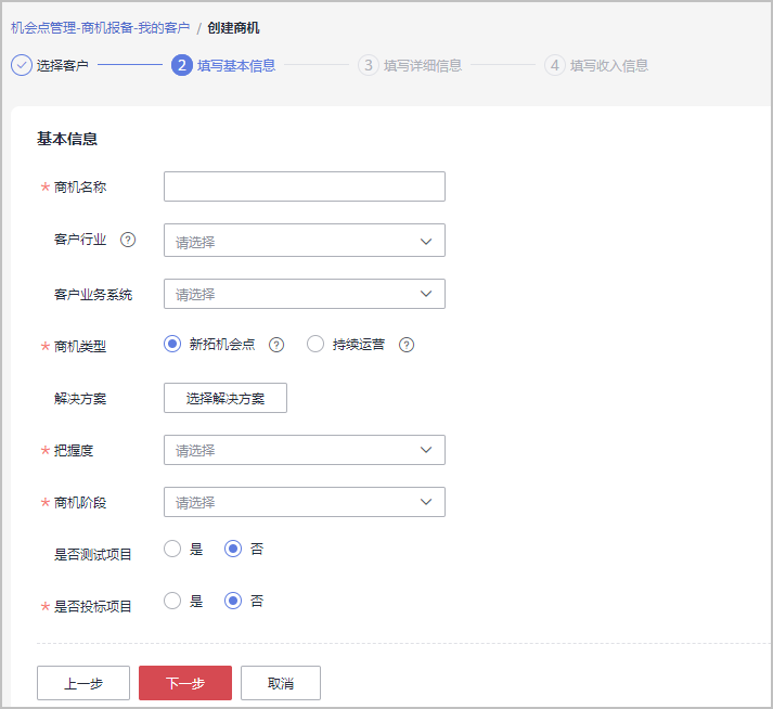 您也可在“拓新 > 营销任务 > 销售拓展任务”页面,单击“操作”列的“创建商机”,进入“创建商机”的第二步“填写基本信息”页面,直接创建与该营销任务关联的商机。
