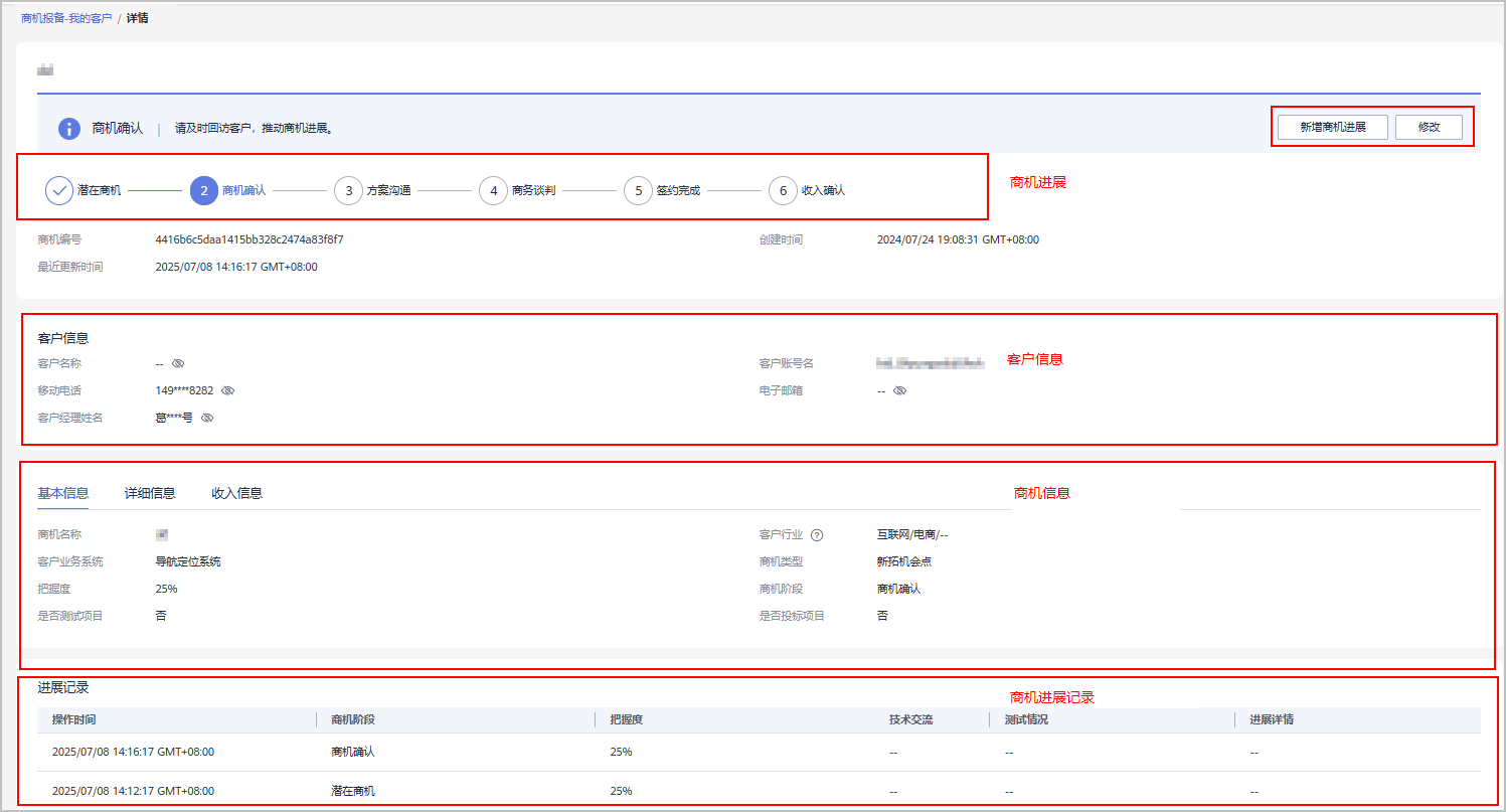 - 单击商机名称,进入“商机详情”页面,可以查看商机进展、客户信息、商机信息和商机进展记录。