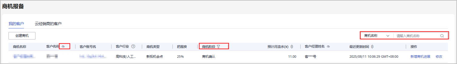 - 选择“我的客户”或“云经销商的客户”页签,选择根据需要设置查询条件,查看客户商机情况。
