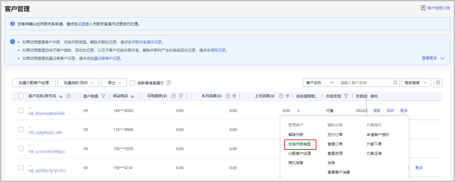 - 找到需要切换关联类型的客户,单击其“操作”列的“更多 > 切换关联类型”。
