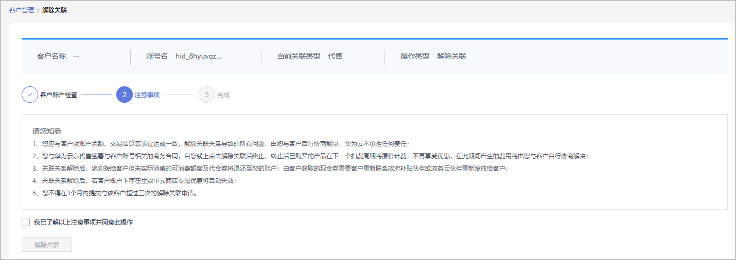 - 客户账号检查通过,在注意事项页面勾选“我已了解以上注意事项并同意此操作”后,单击“解除关联”。