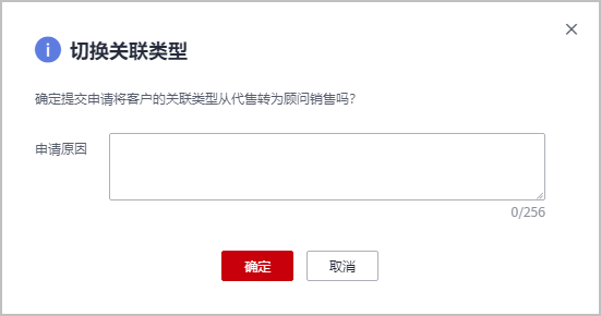 - 在“切换关联类型”提示框中填写申请原因,单击“确定”。