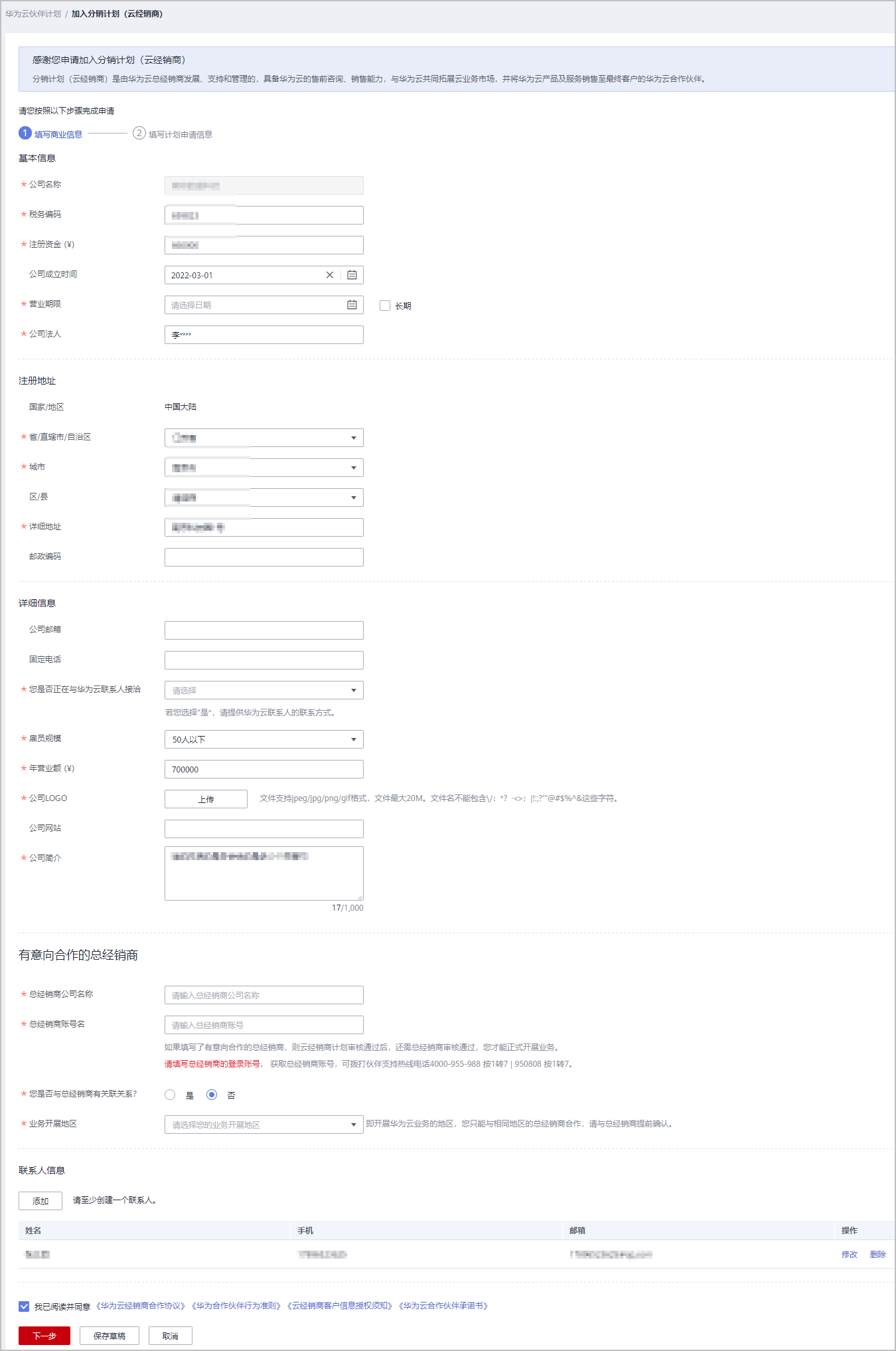 - “业务开展地区”是您开展华为云业务的地区,您只能与相同地区的总经销商合作,在填写“业务开展地区”时请与总经销商提前确认。