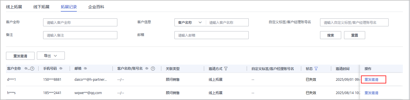 云经销商伙伴可以在“拓展记录”页面,查看已经收到邀请邮件的客户和已经接受线下邀请并完成注册关联的客户。