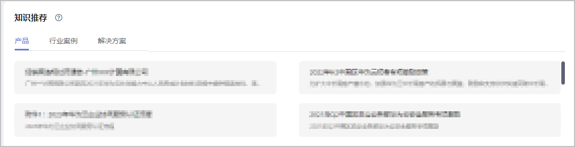 - 选择“概览”页签,在页面末尾可以查看到“知识推荐”卡片。选择产品、行业案例或解决方案,可以查看相应的知识推荐列表。