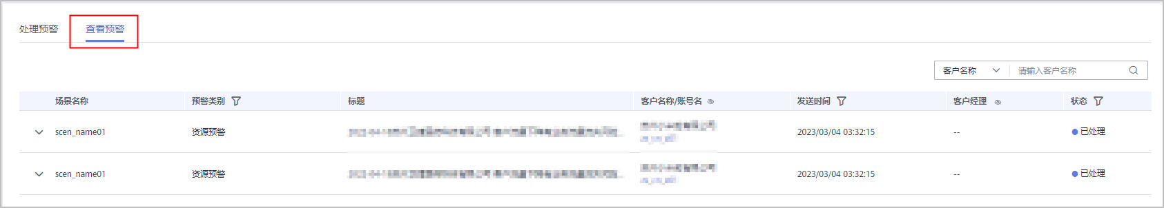,可以查看预警详情,还可以查看已处理的预警的处理信息。 - 伙伴可以在页面右上角输入客户名称或客户经理姓名进行查询。