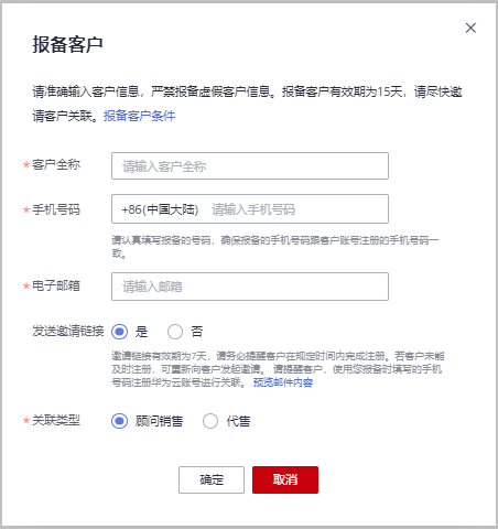 - 发送邀请链接:总经销商伙伴无需进行额外操作。客户收到邀请链接后,可以按照链接提示关联合作伙伴,详细操作可参见客户通过邀请链接关联合作伙伴。