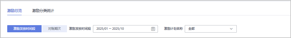 - 按”对账期次”或者按”激励发放时间段”查看激励汇总数据。