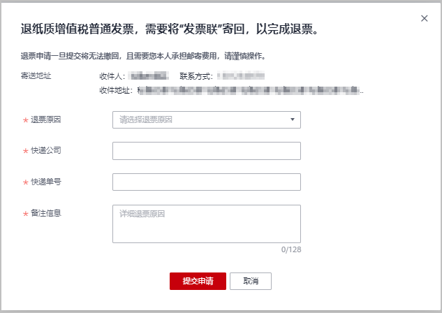 - 纸质普票:在退票弹窗中查看寄送地址(包括收件人、联系方式和收件地址),然后将发票联原件寄出。寄出后,在退票弹窗中选择退票原因,输入快递公司、快递单号和备注信息,点击“提交申请”。华为云工作人员将在收到发票原件后的2-3个工作日内完成退票。