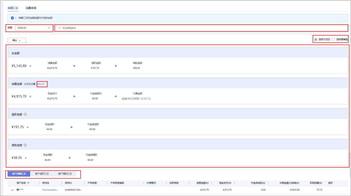 - 选择账期(默认为当前月),根据需要设置查询条件,查看客户的消费汇总信息。