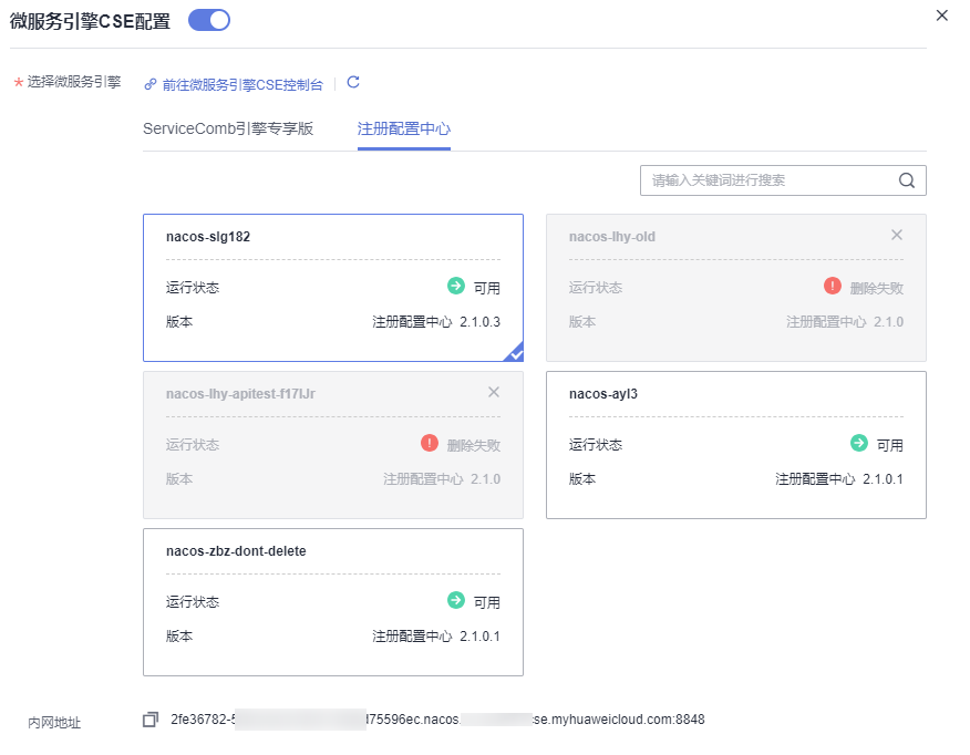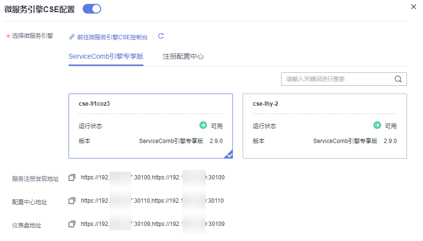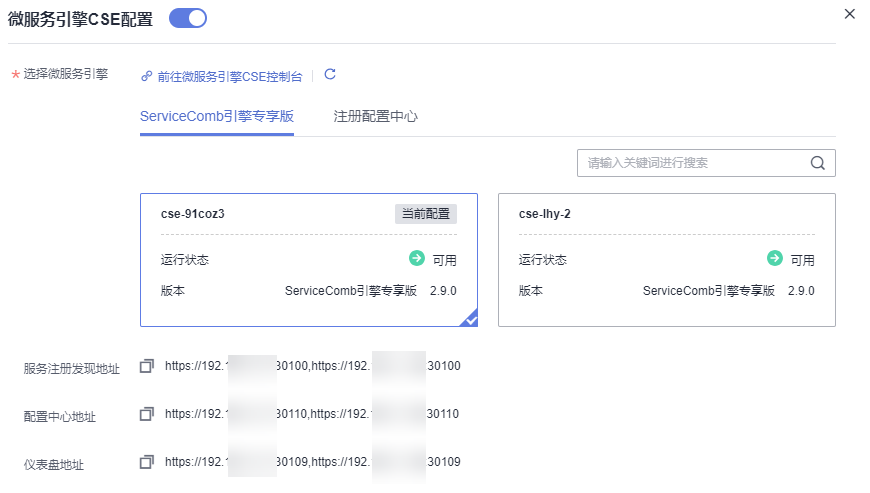 - 请单击“前往微服务引擎CSE控制台”,进入CSE控制台创建微服务引擎,具体步骤请参考创建ServiceCombl引擎或创建Nacos引擎。