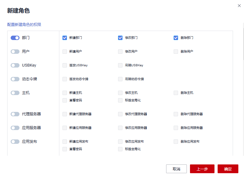 - 单击“下一步”,切换到角色的系统模块权限配置窗口。