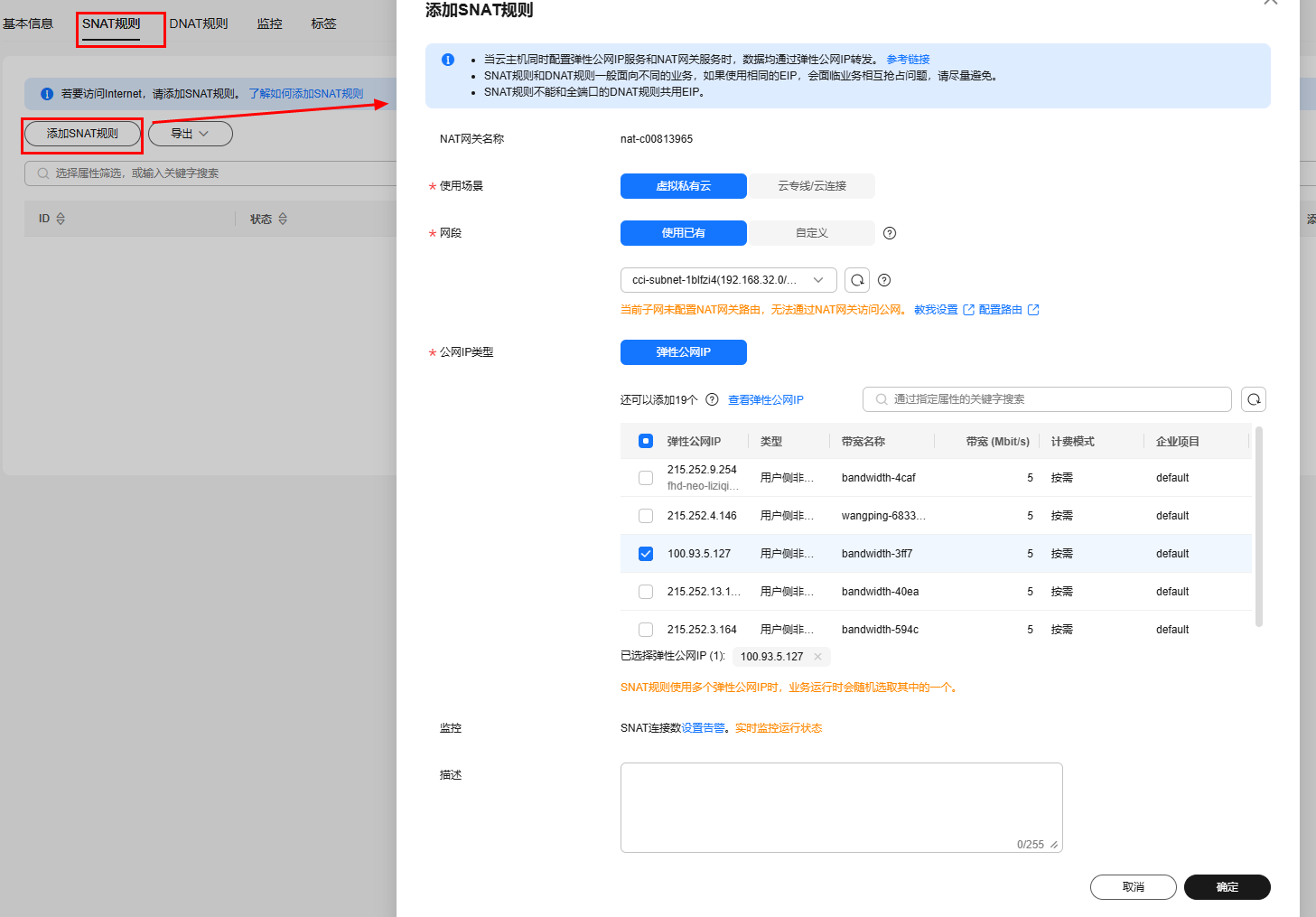 - 配置SNAT规则,为子网绑定弹性公网IP,具体请参见添加SNAT规则。