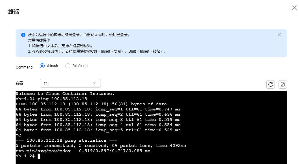 SNAT规则配置完成后,您就可以从容器中访问公网了,如下图示例,从容器中能够ping通公网。