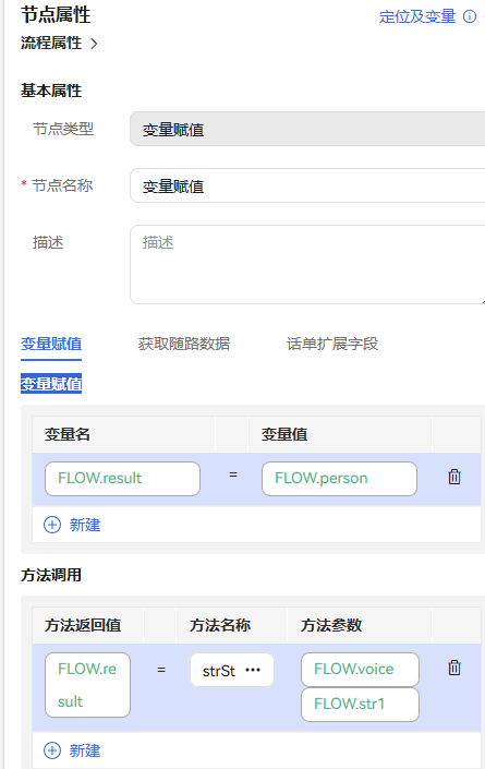 - 在智能ivr流程中配置变量赋值图元,获取随路数据中配置变量接收普通IVR传过来的随路数据。