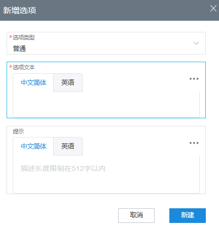 - 单击“新增”,为“单选”或“多选”类型的问卷新增选项列表。