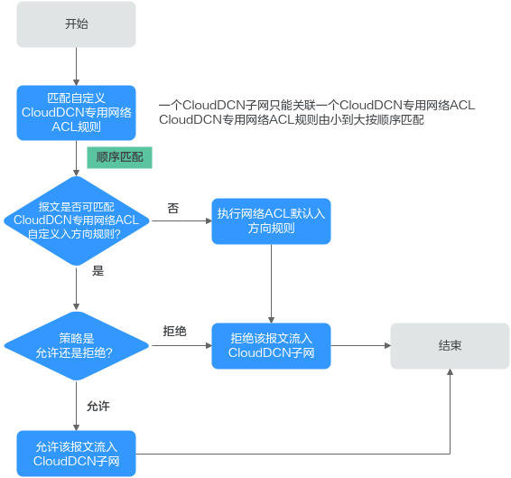 一个CloudDCN子网只能绑定一个CloudDCN专用网络ACL,当CloudDCN专用网络ACL存在多条规则时,流量按照规则的生效顺序进行匹配。序号越小,排序越靠前,越先执行该规则。默认CloudDCN专用网络ACL规则的序号为*,排在末尾,流量最后匹配该规则。