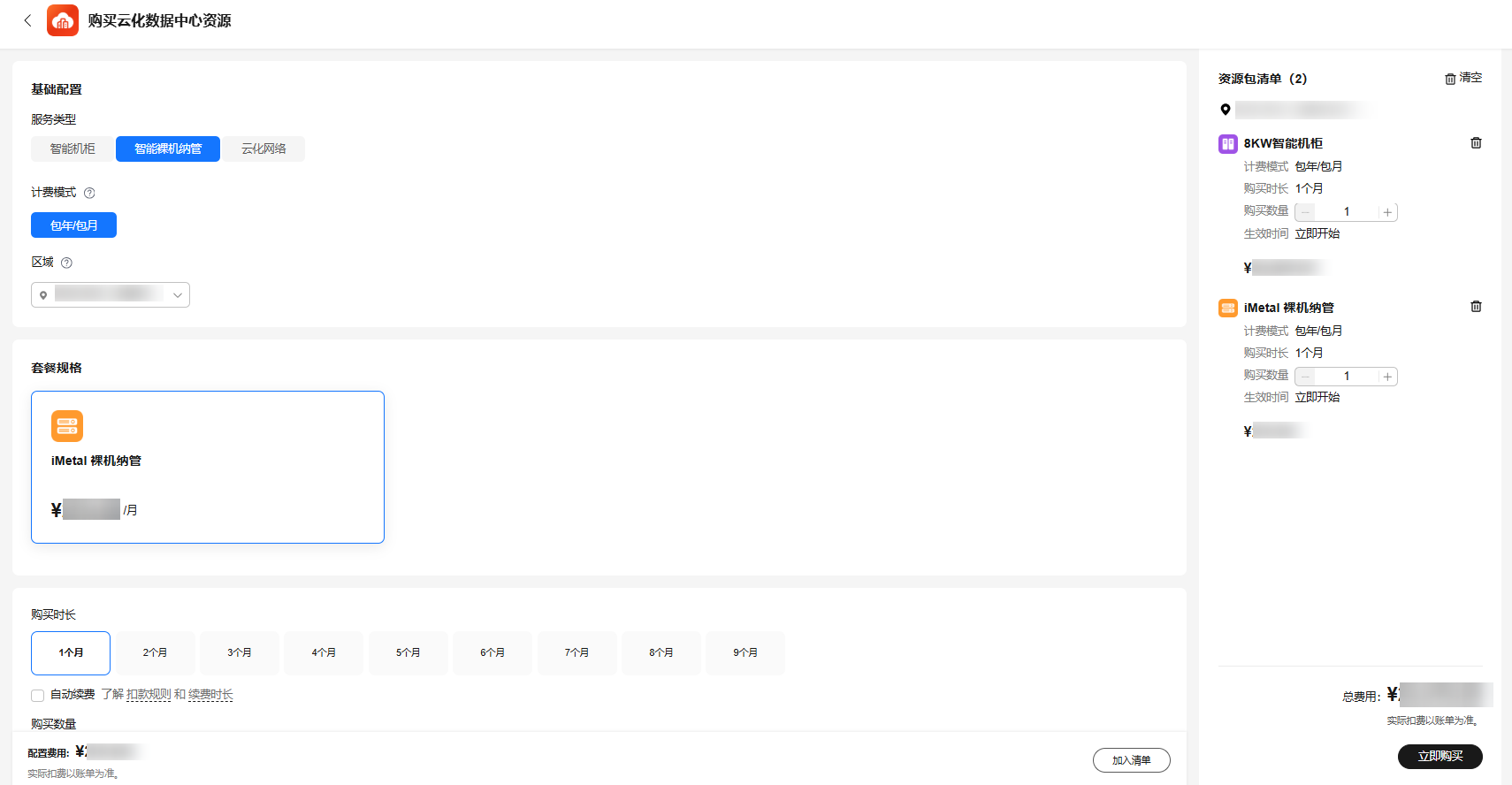 你可以单独购买iMetal服务器相关的“智能裸机纳管”资源,也可以通过组合交易订单方式同时购买iMetal服务器对应的机柜和网络资源。