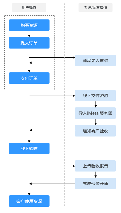 iMetal服务器的购买涉及线下操作与验证,本章节仅介绍购买资源、提交订单、支付订单的操作指导。