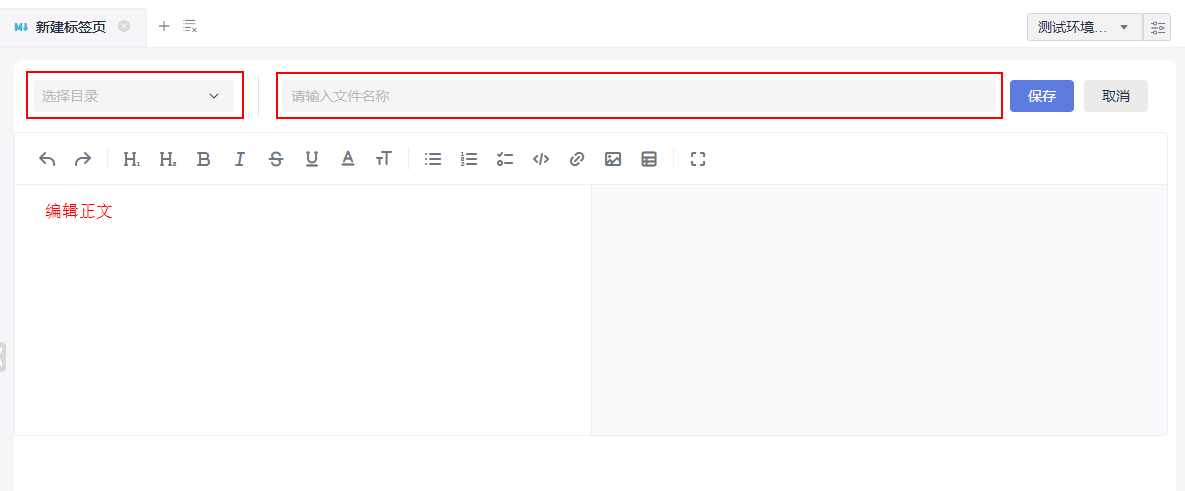 - 进入“新建标签页”,在该标签页可以编辑Markdown文件,主要包括:目录、名称、正文。