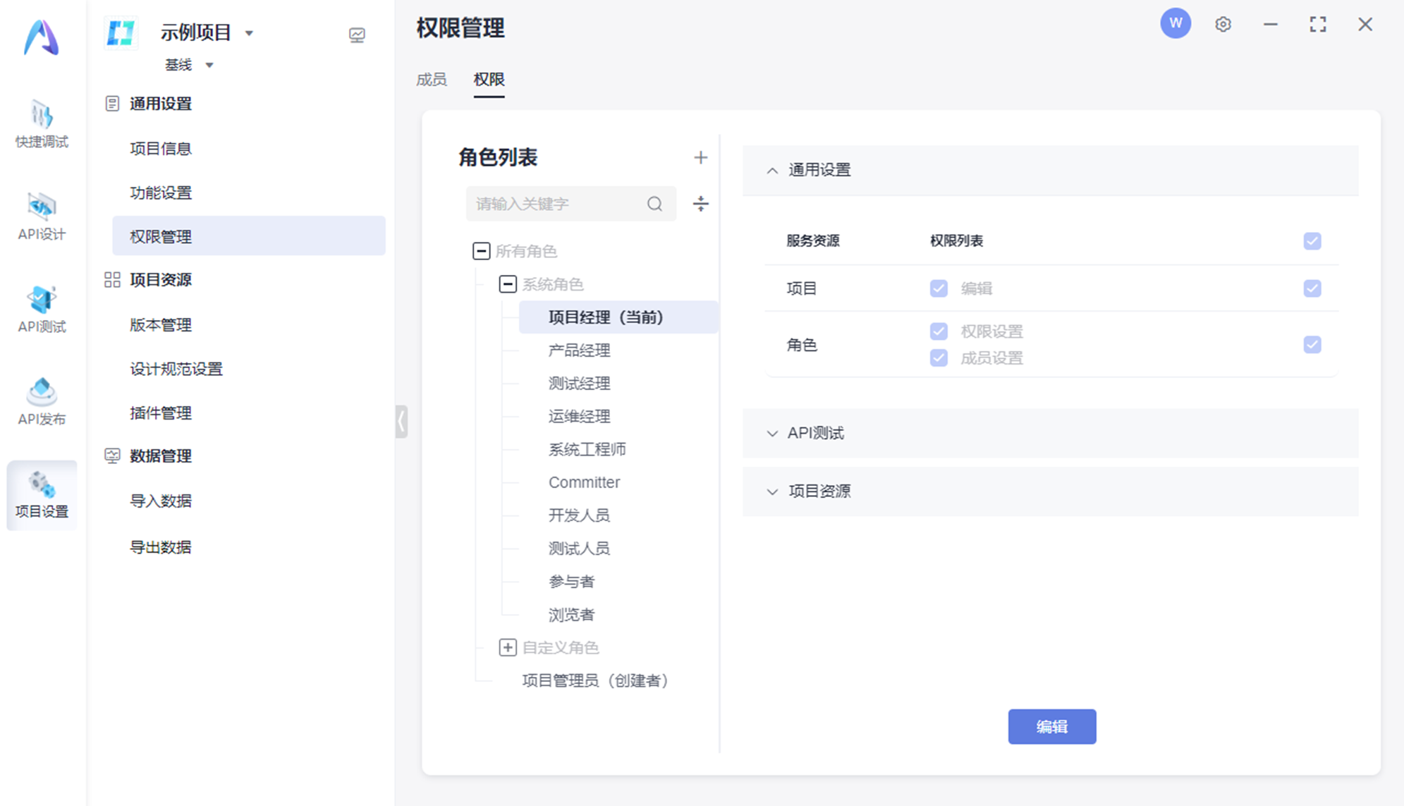 为项目各个角色设置不同操作权限,包括项目基本信息的编辑和归档、角色及权限的设置和成员设置,还可以根据需要自定义角色类型并授权。