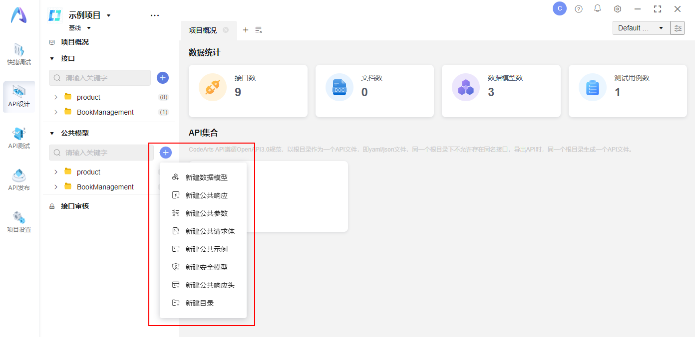 ,新建不同类型公共模型,CodeArts API提供以下7种公共模型定义:数据模型、公共响应、公共参数、公共请求体、公共示例、安全模型、公共响应头。