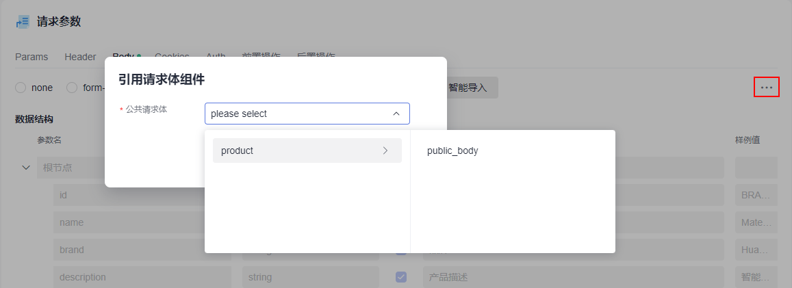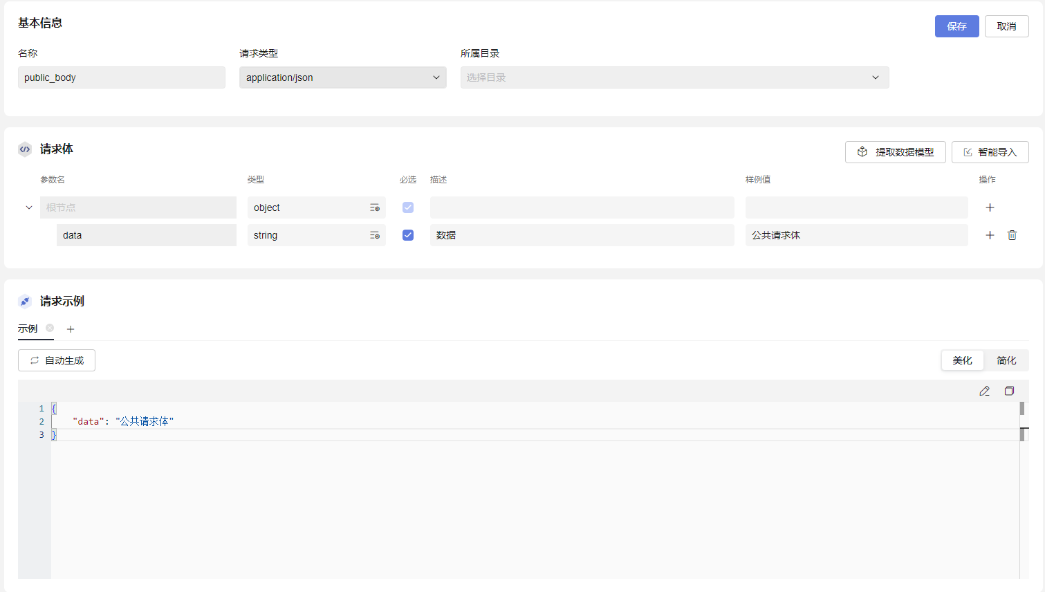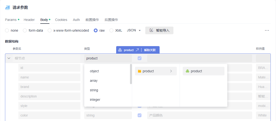 支持将请求体中数据结构提取为数据模型,以及单击“智能导入”,根据输入的Json自动生成数据结构功能。