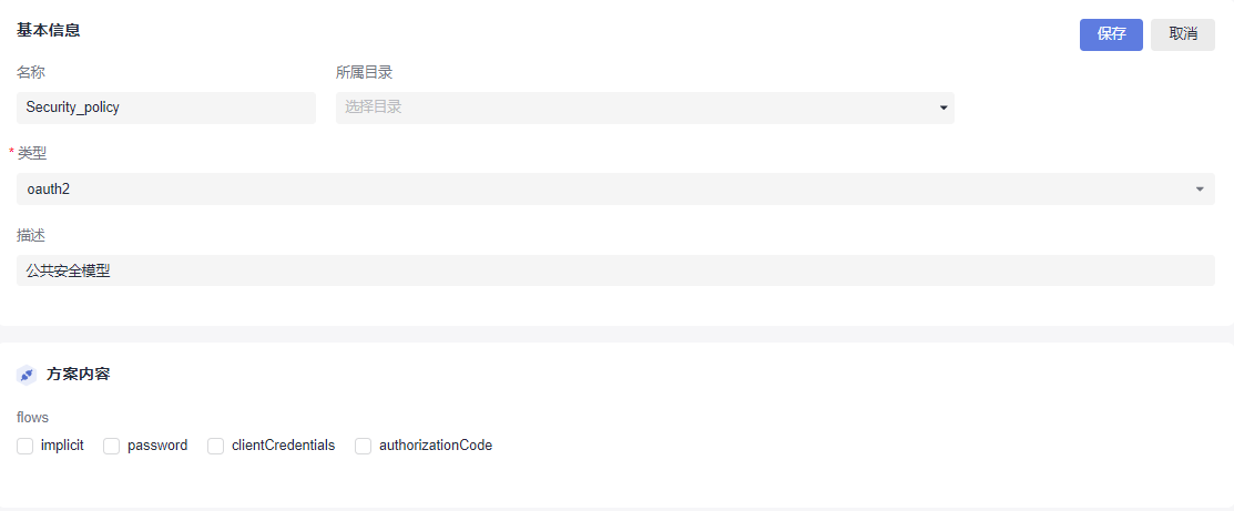 安全模型类别提供“http”、“apikey”、“oauth2”、“openIdConnect”四种类型选择,选择不同类型的安全模型后,需要在方案内容中完善相关必填信息,用于API设计中“安全方案”的引用。在安全模型的文档页可以查看引用当前安全模型的API,可通过单击引用的API,跳转打开API详情页。