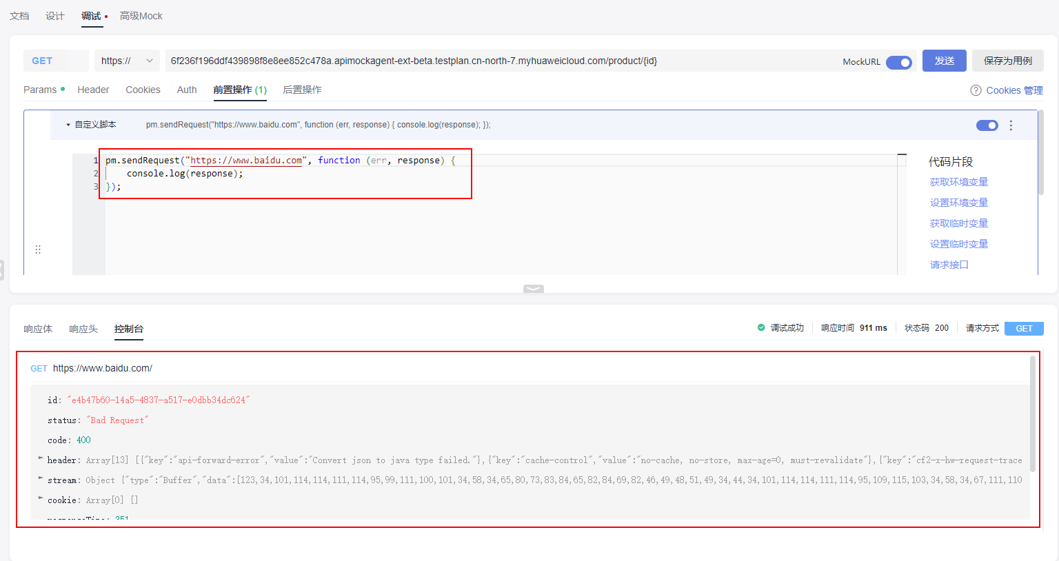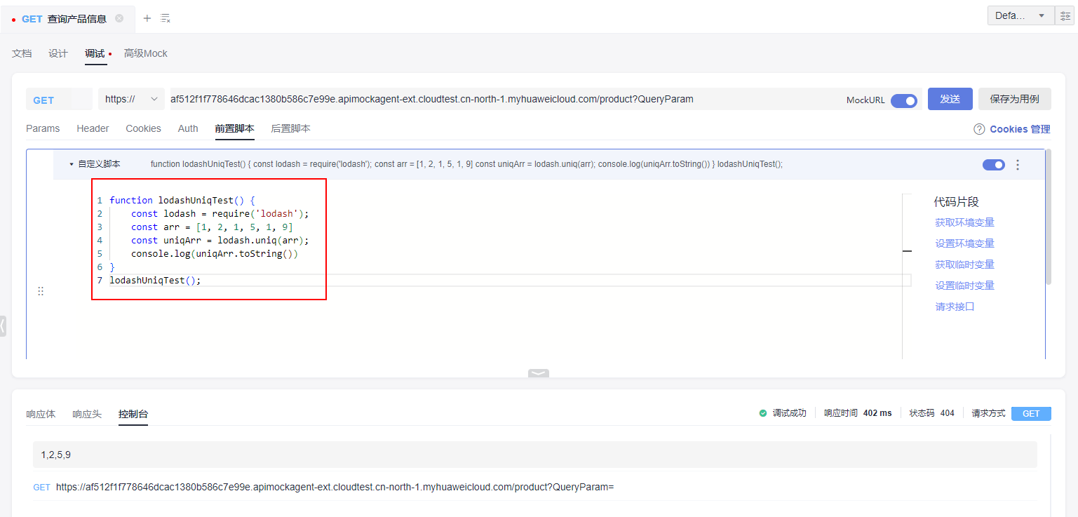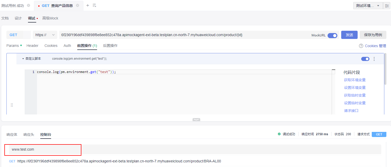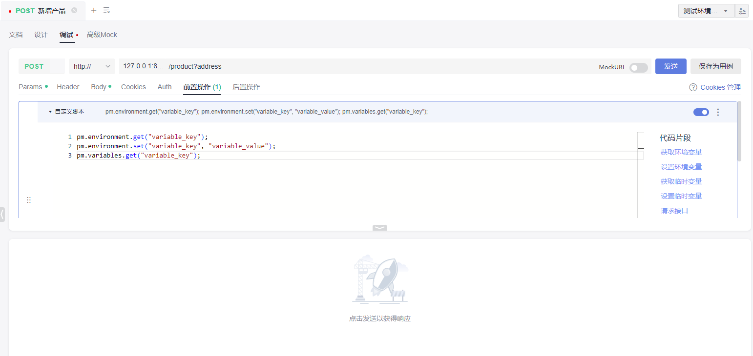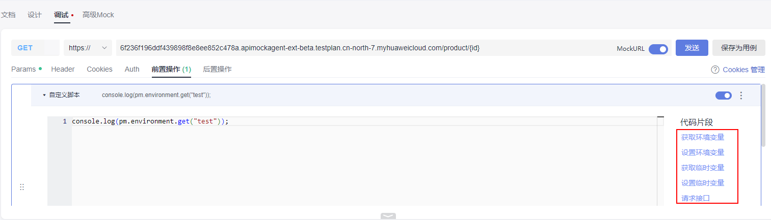 前置脚本是在请求发送前执行的代码片段。例如需要在请求头中生成时间戳、打印日志、设置随机参数值等。可以在接口的“前置脚本”页面中单击“添加前置操作 > 自定义脚本”,发送接口请求前将自动运行前置脚本。