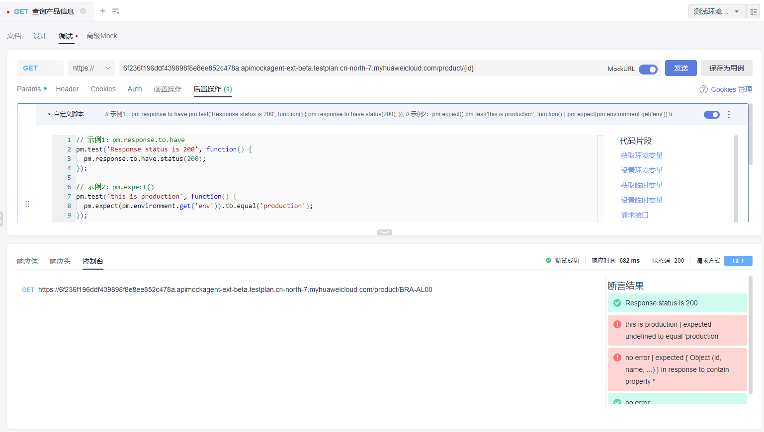 后置脚本是在请求发送后执行的代码片段,主要用于验证请求返回的结果(断言)、将请求返回的结果数据写入环境变量等场景。可以在接口的“后置脚本”页面中单击“添加后置操作”,发送接口请求后将自动运行后置脚本。