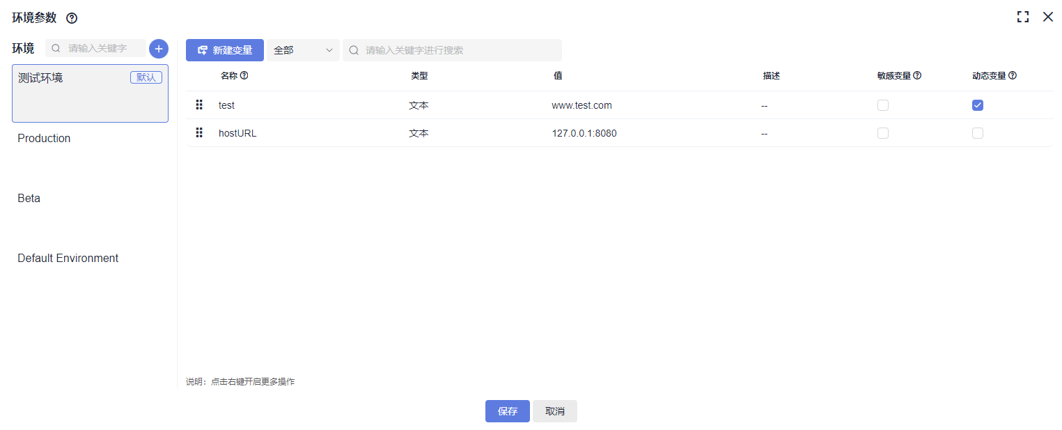 在开发项目中,不同阶段对应不同环境,例如:前端与后端的开发人员需要在研发环境做功能联调,测试人员需要在测试环境测试,上线生产环境前也需要在预发环境验证,不同环境对应不同的前置URL和接口参数值,为了方便快速切换运行环境,快速修改前置URL等参数,CodeArts API提供了环境管理功能。